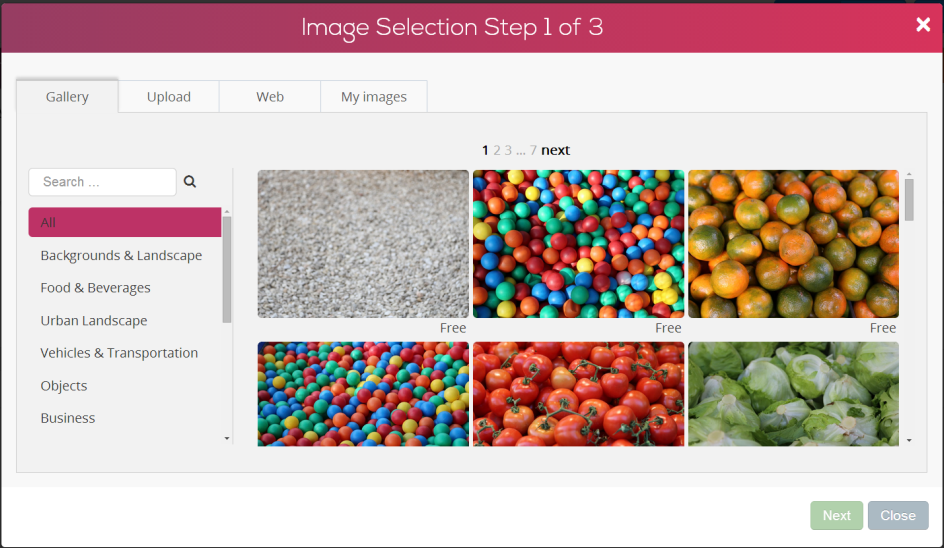 Gallery: Select an image from Simbla's Image Gallery. In the gallery, you can find pictures by category. Some of the pictures must be purchased.