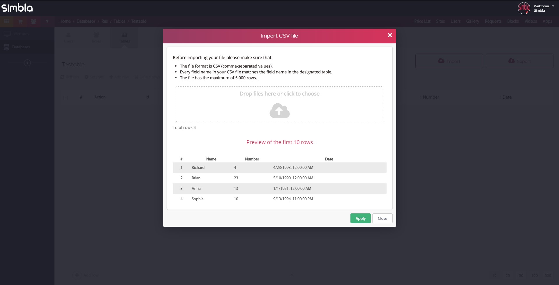 You do not need to add the three fixed fields that Simbla adds to your table—they are self-generated (Id, updatedat, createdat). However, you do need to make sure that all the fields match exactly in your file and your Simbla table as shown in the next example( Name, Number, Date):