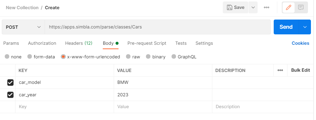 For cars table our URL is https://apps.simbla.com/parse/classes/Cars